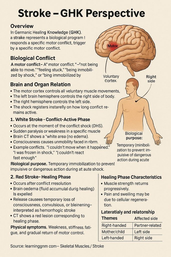 In Germanic Healing Knowledge (GHK), what is commonly called a “stroke” represents a biological program controlled from the motor cortex of the cerebrum. It is not viewed as a random vascular event, but as a meaningful process triggered by a specific motor conflict.