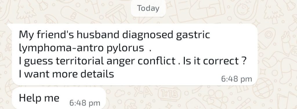 Although conventional medicine labels conditions such as gastric lymphoma or gastric cancer, GHK interprets the tissue changes according to the embryological origin of the stomach area involved and the type of biological conflict experienced.